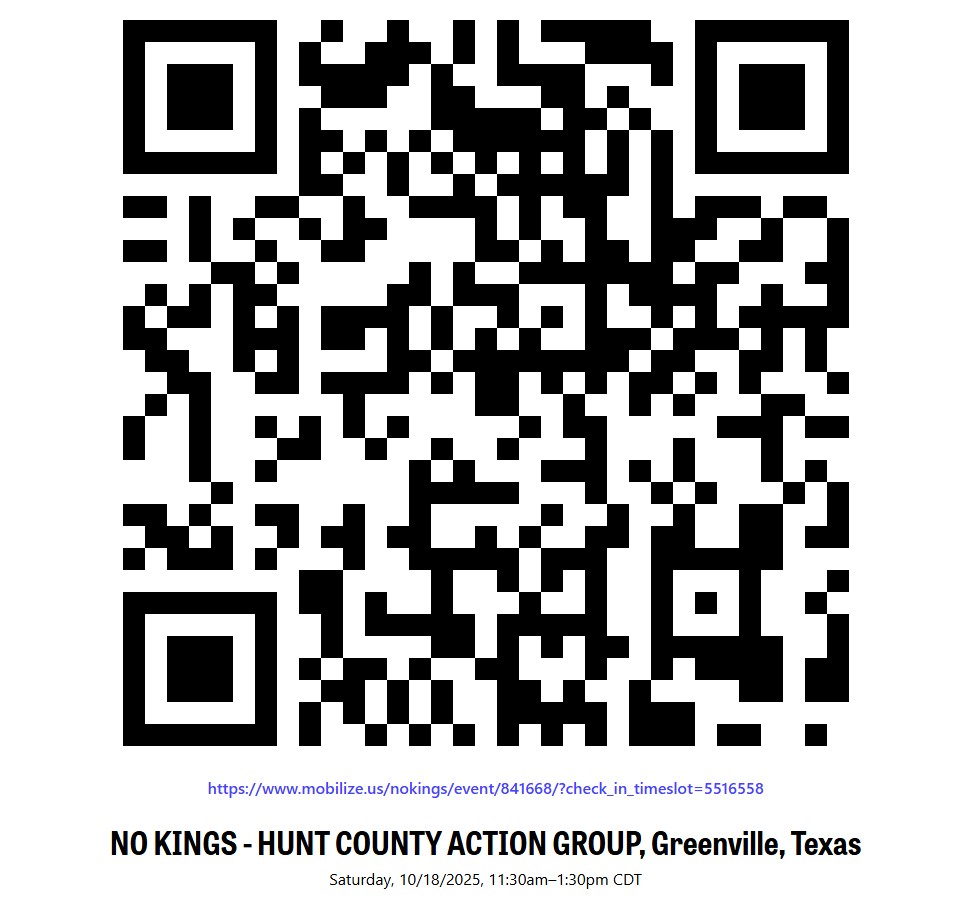Use the QR code below to register for the NO Kings 2 Rally in Greenville, Texas with Mobilize.